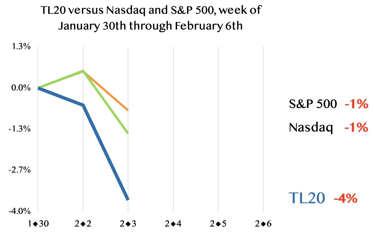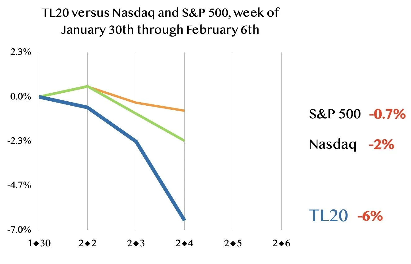 The week that ended January 23rd saw stocks fall fractionally for the major indices, Nasdaq and Standard & Poor’s 500, and a one-percent fall for the TL20 group of stocks to consider, and the names that sold off the hardest suggest the divide between artificial intelligence infrastructure and everything.