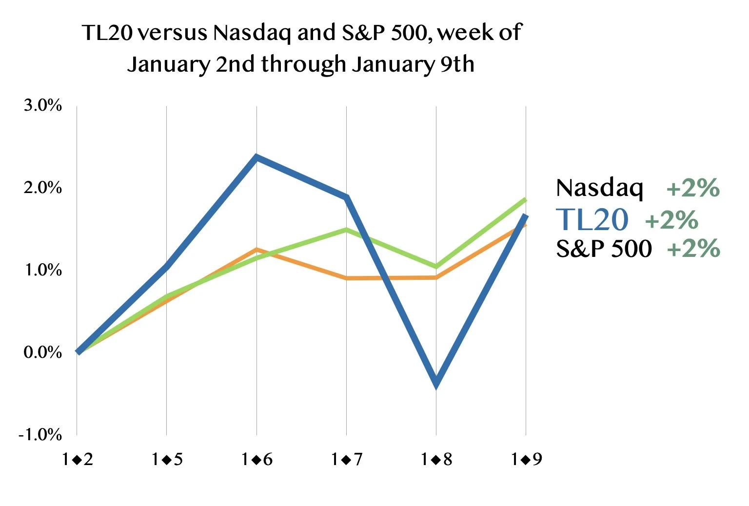 Now, this is what I like to see at the start of a new year: the TL20 group of stocks to consider rising by a point on their first day while the major indices decline slightly.