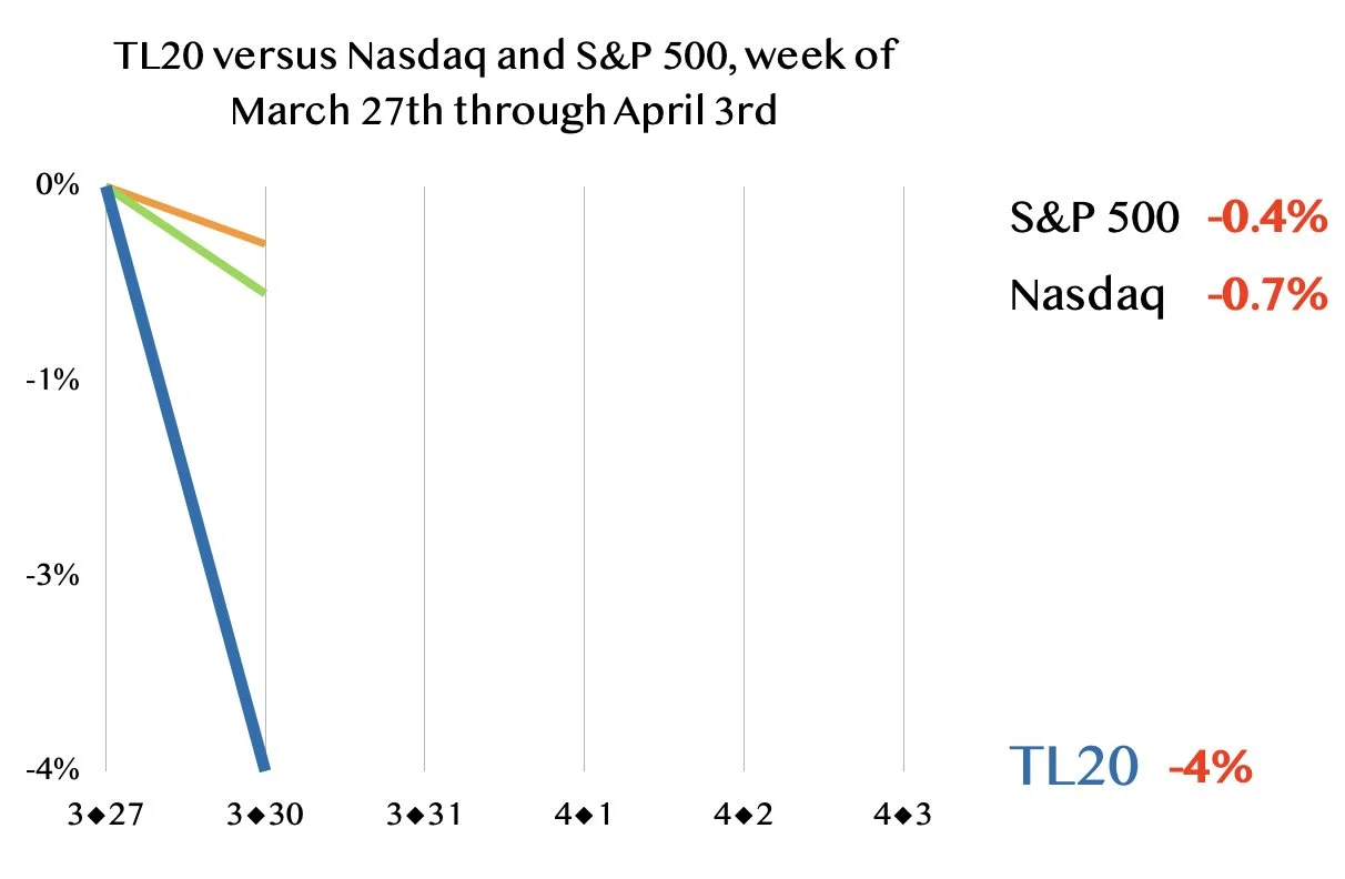 The week that ended March 27th brought the biggest challenge to the group of the TL20 group of stocks to consider since the beginning of the year, pushing the TL20 down 4%, erasing all gains for the year.