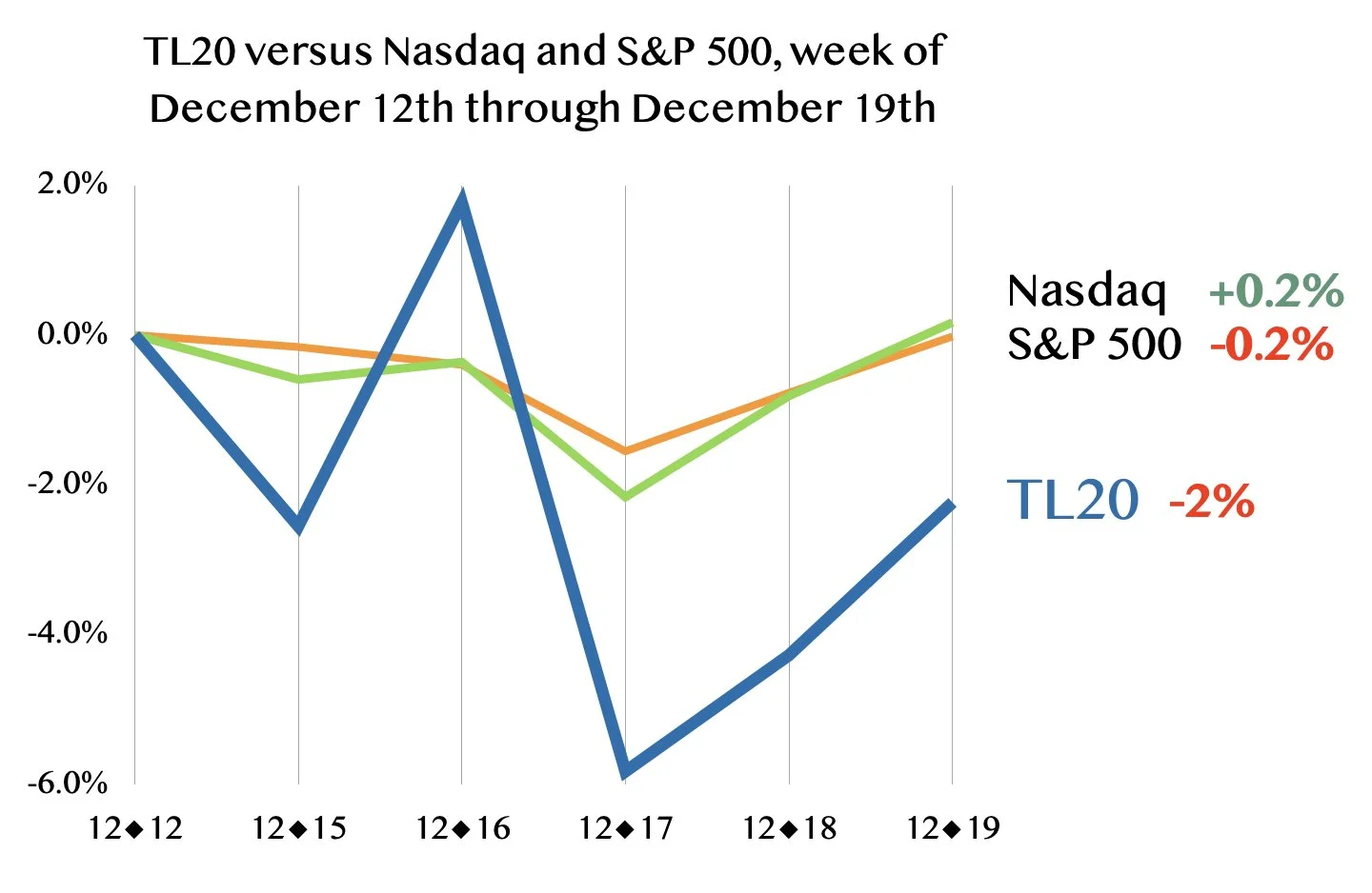 The TL20 group of stocks to consider on Friday hit its lowest level since December 31st, elegantly erasing the year’s gains. The stock suffered worse than the Nasdaq Composite Index and the S&P 500 this week, with the 5.5% drop on Thursday being the group’s fifteenth-worst single-day decline. A summary of where they’re at.
