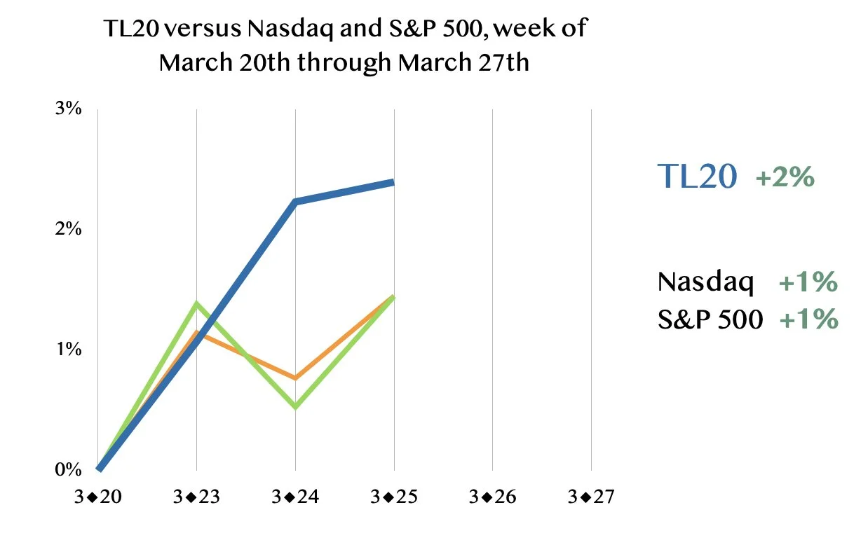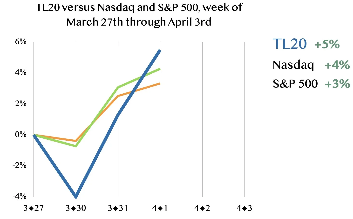 Year to date, the TL20 is up 5%, better than down 7% for the Nasdaq Composite, and down 5% for the S&P 500.